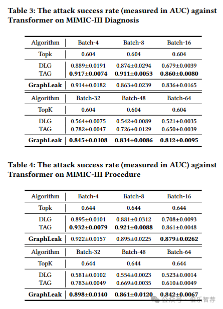 Baseline:TopK、DLG、TAG、iDLG在 eICU 数据集上,对于不同的梯度攻击算法,AUC 随批量大小的增加而变化如图 3 所示。可以看出,当批次较小时,DLG 和 TAG 都可以获得良好的性能,比 TopK 基线要好得多。然而,随着批量大小的增加(大于 4),AUC 迅速下降,甚至接近随机猜测。相反,在知识图谱的帮助下,GraphLeak 的数据恢复性能保持很高。