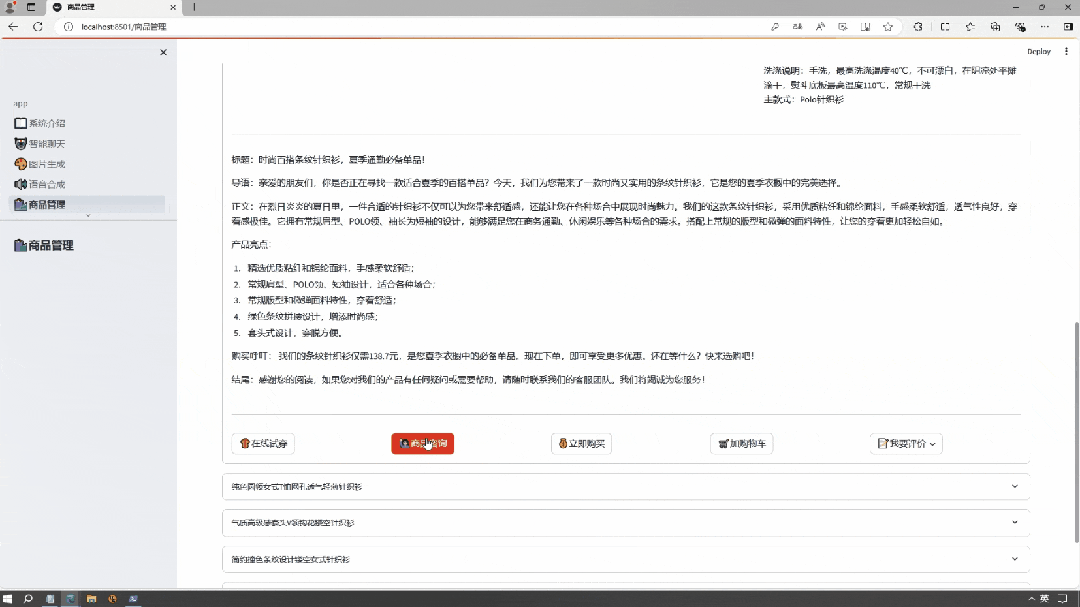 - ?文案生成功能:项目提供了文案生成功能,对于卖家而言,在商品录入阶段,可以根据商品的属性、商品的平铺图等生成商品营销文案;对于买家而言,在商品咨询阶段,可以根据商品信息生成商品介绍文案,激活用户的购买欲望,为促成交易创造条件。