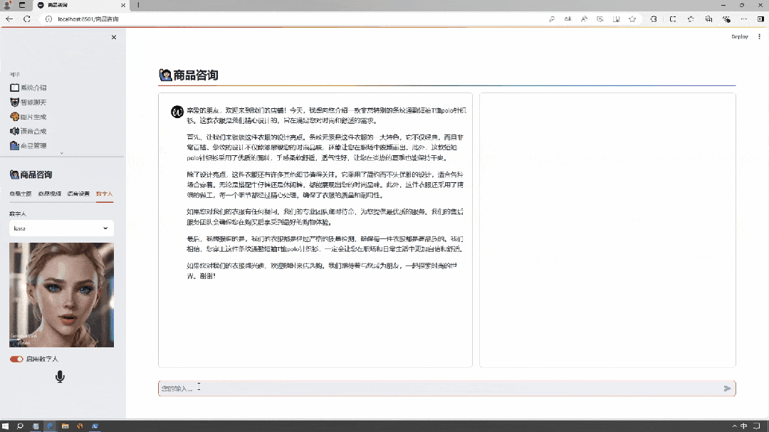 - ?数字人功能:项目提供了?文本回复、?语音回复、?数字人回复等功能,让用户摆脱枯燥的交流方式,增加了更多形式的交流方式,增强了用户体验。