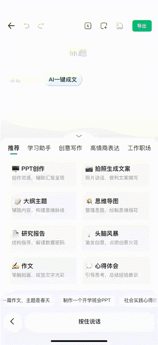 只需将已有的素材输入系统,无论是一句要求、一篇文档、一张图片,还是多种格式组合输入的复合型需求,系统都能快速理解并生成满意的作品。这种无门槛的输入方式,大大降低了用户的操作难度,使得每个人都能轻松利用AI摸鱼。做过学生和乙方的都知道这里面门道有多深:万事开头难,做报告、PPT、材料的由头往往极为“抽象”,从课堂上老师的课件、文献资料和研究报告、到老板指点江山时灵光乍现的金点子,都能成为一座大山,压在这届马喽头上,落实成一个“做PPT”或“绘制图表”的任务。