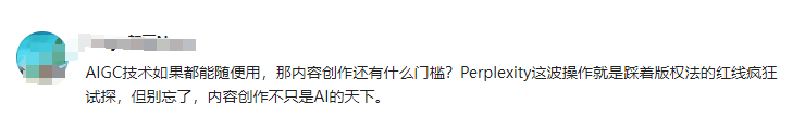 传统版权通常归属于创作者或创作者雇主,但AI版权可能归属于训练数据的提供者、算法开发者、系统操作者甚至最终用户,这导致新闻、出版机构在面对科技企业推出的AI工具整合新闻和内容时,可能损失相关流量和广告收入。当地时间10月21日,《华尔街日报》母公司道琼斯和《纽约邮报》对人工智能初创公司Perplexity提出侵权诉讼,指控后者抄袭受版权保护的新闻内容,并利用这些新闻内容生成对用户提问的回复,从而抢走了原本会流向这两家出版商网站的流量。而在一周前的10月15日,Perplexity刚刚收到了来自《纽约时报》的警告,要求其在10月30日前停止使用《纽约时报》的内容。很多网友对此也给出了自己的看法。