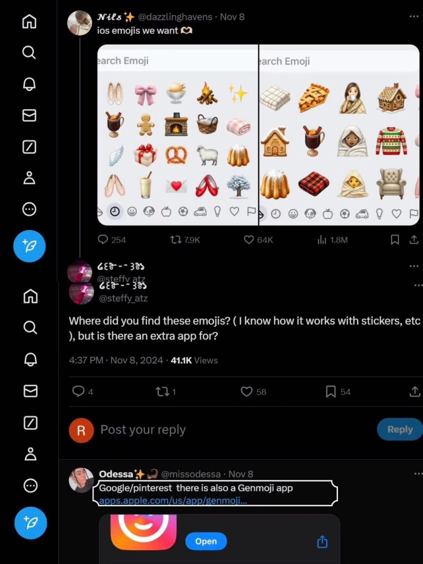 X 平台上一篇关于苹果 Emoji 符号的分享帖,浏览量高达 180 万,点赞量达 64 万,经常逛 X 的读者们,肯定知道这个数据在 X 上的含金量。在这篇帖子下,有网友询问博主:“你是从哪儿找到这些符号的?有没有其他类似的应用程序呢?” 有趣的是,笔者此前在各大社交媒体平台均未检索到的 App 相关信息,却出现在了这条评论的回复中,有用户向提问的网友推荐了本文主角 Genmoji。
