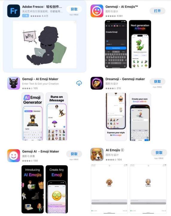 时间转眼来到今年 6 月 11 日,在 2024 年度 WWDC 全球开发者大会上,苹果宣布为 iOS 18 系统引入名为 Genmoji 的新功能,再度点燃了 Emoji 产品的热度,原本沉寂许久的 Emoji 类产品又纷纷在市场上有了新动静。自 9 月起,一大批主打“AI+Emoji”的新产品涌现,如 Gemoji - AI Emoji Maker、AI Emojis、Dreamoji - Genmoji maker 等。