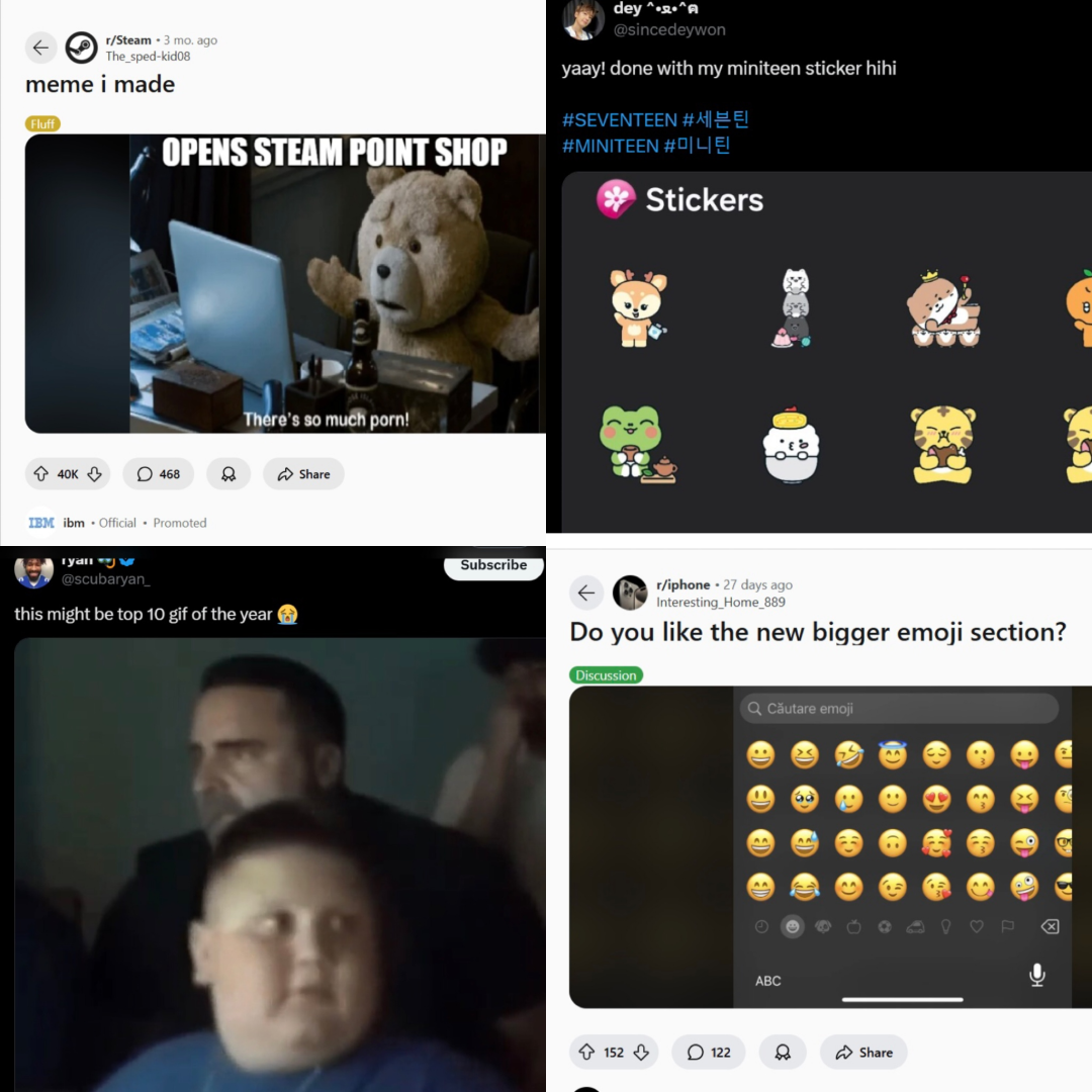 点点数据显示,该 App 在美国地区 11 月的 RPD 仅为 0.06 美元,且回落前后数值基本不变,即便 Genmoji 在后续投起了 ASA 广告来吸引更精准的客户,RPD 也并未出现上升。而在 Genmoji 这个产品本身之外,放眼 Emoji 的整个赛道,我们会发现 AI 与 Emoji 放在一起,可能也并不会产生太大的化学反应。Emoji 是一个很大的需求,背后的赛道却很“有意思”,基本上可以概括为需求很大,供给也很丰盛,且“散落”在各处。Adobe 的《创意未来:全球表情符号趋势报告》表明,全球约 92% 的用户常使用 Emoji,主要在通讯 App 和社媒里用。但因跨文化解读有别,不同地区、年龄、文化背景的人对同一 Emoji 理解可能完全不同。像我发骷髅头是表示害怕,美国年轻人却用它表示笑得厉害。在 Reddit 上,蛋糕 Emoji 有人觉得是谎言,有人觉得代表好品质,还有人就觉得只是蛋糕。