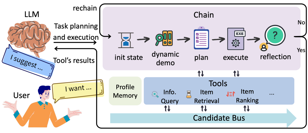 为了有效管理 InteRecAgent 内部候选商品的流转,并解决输入上下文长度限制的问题,我们引入了两个关键模块:候选者总线 (Candidate Bus) 和用户档案 (User Profile)。