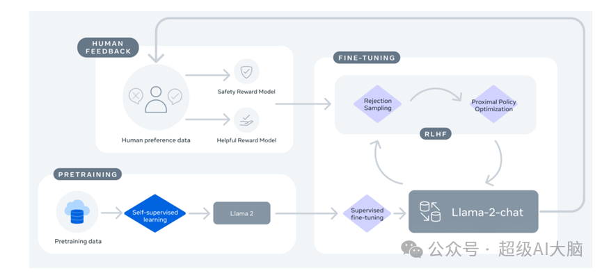 强化学习方法:采用基于人类反馈的RLHF方法,包括拒绝采样和近端策略优化(PPO)。奖励模型更新:在RLHF阶段,人类偏好数据并行迭代,以保持奖励模型的持续更新。