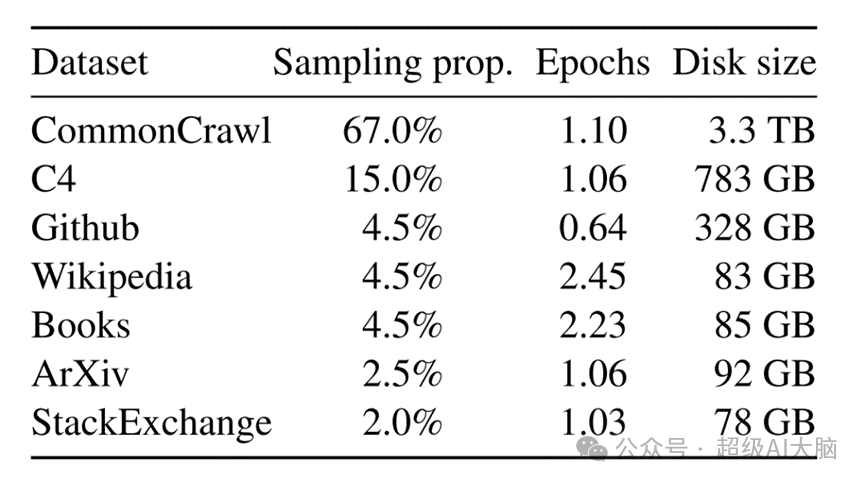 这些用于预训练的数据集来源于多个不同的渠道,并且所有数据均为公开可获取。具体各个数据源的贡献量以及它们在预训练中被采用的采样比例如下表所示: