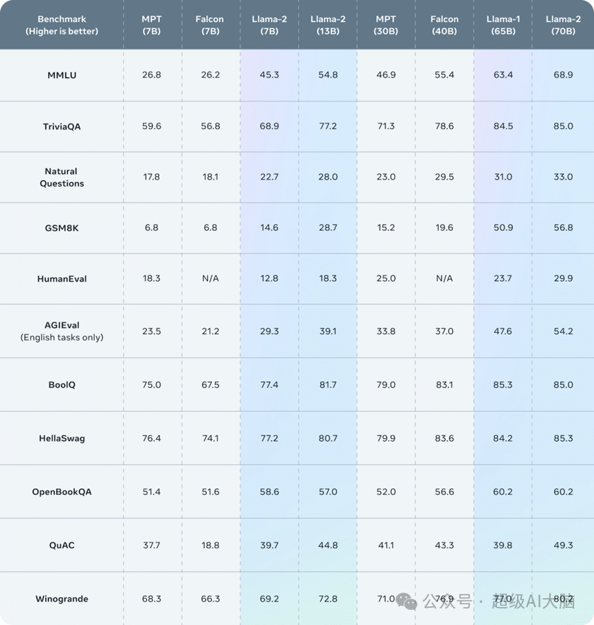 这些改进使Llama-3的训练效率比Llama-2提高了约三倍。微调方法:Meta在微调阶段进行了创新,结合了SFT、拒绝采样、PPO和DPO。复杂任务优化:综合方法提升了模型在复杂推理和编码任务中的表现,特别是在逻辑推理问题中选择最合适答案的能力。Meta官方数据显示,Llama-2在众多基准测试中都优于Llama-1和其他开源语言模型。
