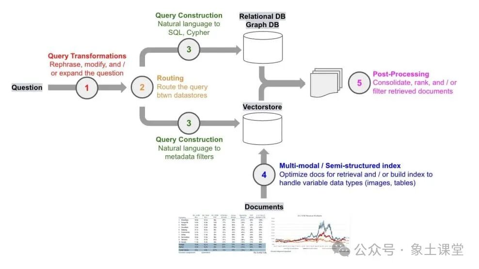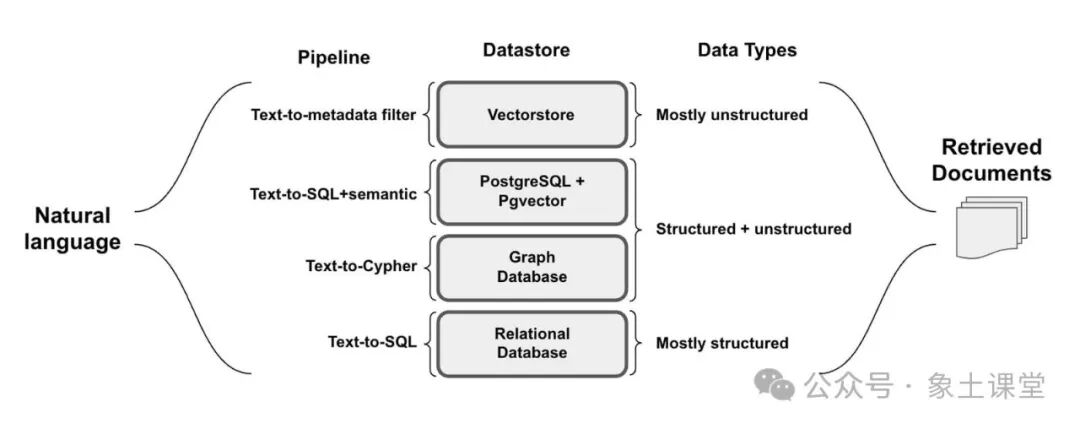思考RAG落地的第三个问题是:在考虑RAG时需要问的一个问题是,查询数据所需的语法是什么?虽然路由的问题是用自然语言提出的,但数据存储在诸如关系型数据库或图数据库等源中,这些源需要特定的语法来检索数据。即使是向量存储也利用结构化的元数据进行过滤。在所有情况下,查询中的自然语言需要转换为检索的查询语法。