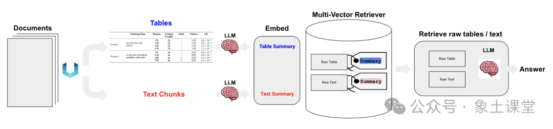 也适用于包含文本和表格混合的半结构化文档。在这些情况下,可以提取每个表,生成适合检索的表摘要,但将原始表返回到LLM进行答案合成。