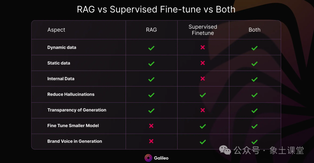 RAG和微调为使大模型具有实时性并减少幻觉等问题行为提供了互补的优势和劣势。微调有助于使大模型专注于特定领域、词汇或新颖数据,但需要时间和计算资源,存在灾难性遗忘的风险,并且无法解决互联网快速演变的特性。RAG利用外部知识以增加事实和时效性,但仍然面临有关最佳检索的挑战。