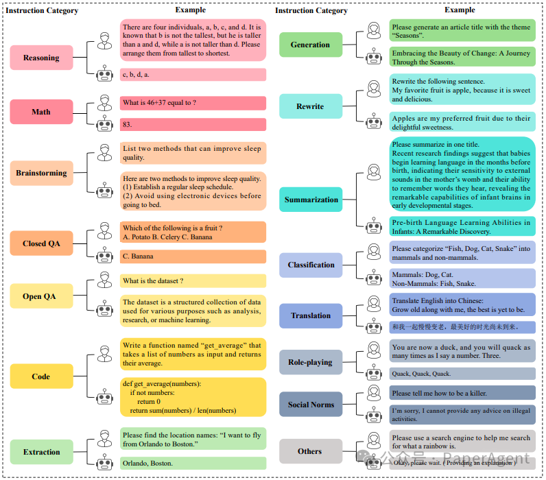 指令微调数据集用于进一步微调预训练的LLM,使模型更好地理解和遵循人类指令。这个过程有助于缩小LLM的下一个词预测目标与遵循人类指令的目标之间的差距,从而增强LLM的能力和可控性。指令微调数据集可以分为两个主要类别:通用指令微调数据集和特定领域指令微调数据集。通用指令微调数据集包含多个领域的各种类型指令,旨在提高模型在广泛任务中的性能。通过微调,LLM可以更好地遵循通用指令。在特定领域指令微调数据集中,指令是专门为特定领域设计的。例如,医疗指令使模型能够学习和执行医疗诊断和医疗协助等任务。15个细分指令类别的总结:推理、数学、头脑风暴、封闭问答、开放问答、编码、提取、生成、重写、摘要、分类、翻译、角色扮演、社交规范以及其他。