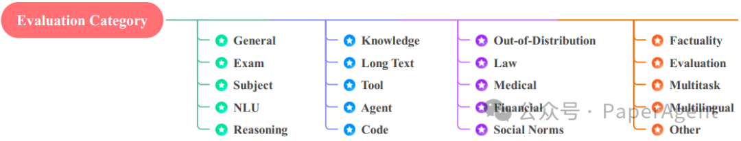 评估数据集是一组经过精心策划和注释的数据样本,用于评估LLM在各种任务上的表现。不同的评估数据集关注不同的评估方面,为不同模型提供客观的衡量标准。仅通过调整训练条件,包括预训练语料库、指令微调数据集和偏好数据集,LLM在相应评估数据集上的表现可以间接反映数据集的质量和有效性。这反过来有助于持续优化训练数据。112个评估数据集的20个评估类别:通用、考试、学科、自然语言理解(NLU)、推理、知识、长文本、工具、代理、代码、OOD(Out-Of-Distribution,分布外)、法律、医疗、金融、社交规范、事实性、评估、多任务、多语言以及其他。