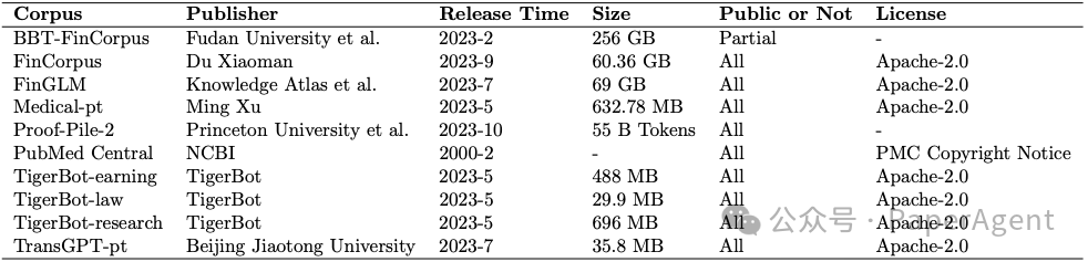 特定领域预训练语料库信息总结。公开与否:“All”表示完全开源;“Partial”表示部分开源。“许可证”表示该语料库遵循某种协议。如果该语料库是基于其他语料库构建的,那么源语料库的许可证也必须遵守。