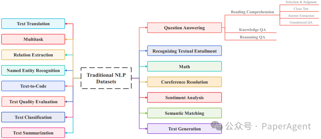 与传统的指令微调数据集不同,将专门用于自然语言任务的文本数据集,在LLM广泛采用之前,归类为传统NLP数据集。这些数据集没有指令格式,专门为训练、优化和测试传统NLP模型而精心设计。由此产生的NLP模型应用于多种文本处理任务,包括文本分类、信息提取、文本摘要等。在当代LLM项目中,大量的传统NLP数据集得到应用。这些数据集扮演双重角色:首先,它们的格式和内容转变为LLM指令引导微调阶段的指令格式,增强模型遵循指令和在这些任务中表现出色;其次,它们作为LLM的评估数据集,使得可以比较不同LLM在自然语言任务上的表现。传统NLP数据集被系统地分类为15个不同的类别,与各种任务相对应。这些类别包括:问答、识别文本蕴含、数学、共指解析、情感分析、语义匹配、文本生成、文本翻译、文本摘要、文本分类、文本质量评估、文本转代码、命名实体识别、关系提取和多任务。传统自然语言处理(NLP)数据集中不同的NLP任务类别