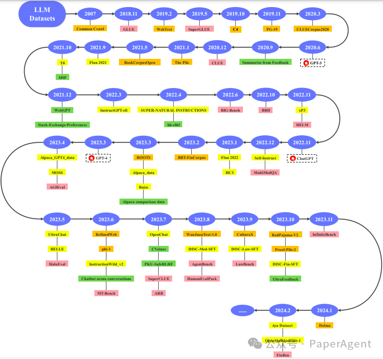 一些代表性的大型语言模型(LLM)数据集的时间线。橙色代表预训练语料库,黄色代表指令微调数据集,绿色代表偏好数据集,粉色代表评估数据集