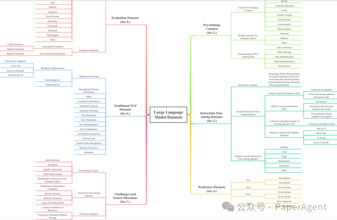论文探索了大型语言模型(LLM)数据集,它们在LLM的显著进步中扮演着至关重要的角色。数据集作为基础架构,类似于根系,支撑并培育LLM的发展。因此,对这些数据集的审查成为研究中的关键话题。为了解决目前缺乏对LLM数据集全面概述和深入分析的问题,并洞察它们的现状和未来趋势,从五个角度整合和分类了LLM数据集的基本方面: