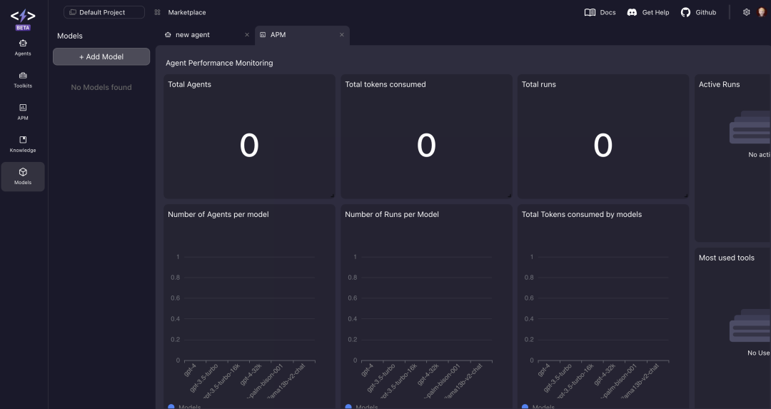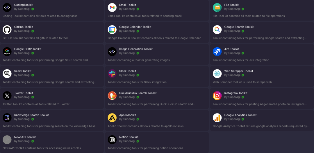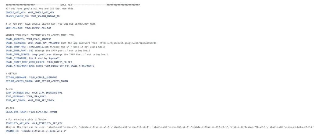 superAGI需要的api在配置agent时,可以自定义知识库、工具调用、model和基本的description、name和goals。这些我在国产的fastGPT上也见过,就是工具调用没有superAGI方便
