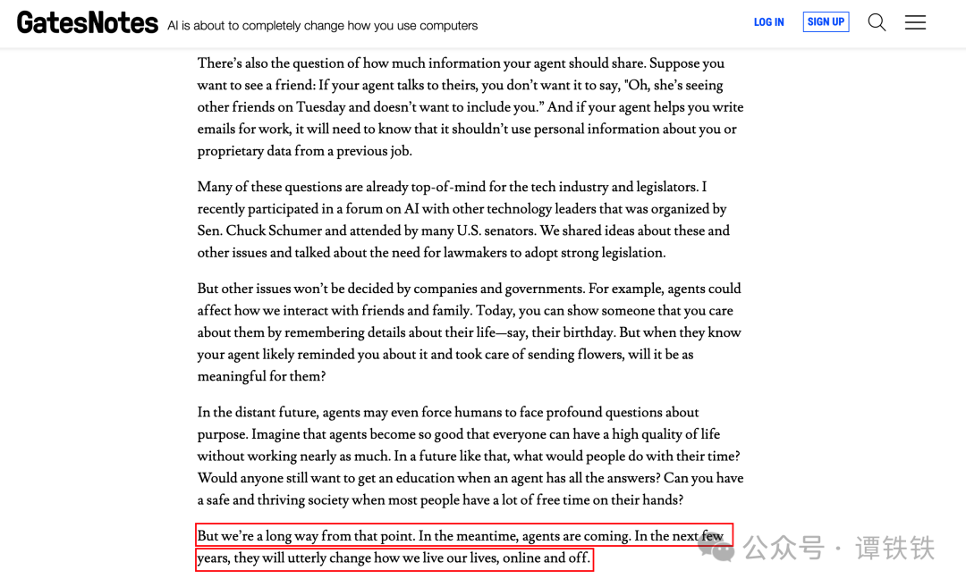 其实 AI Agent 这个词是从去年开始慢慢被大家关注,还记得去年比尔盖茨在他的个人博客上说过的那句话么?
