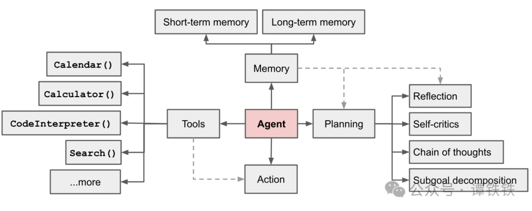 Planning 部分,Agent 会把大任务分解成它可管理可执行的小任务。Tools 部分,Agent 会去执行任务,在模型知识不够的情况下,也会去主动调用外部 API 接口,例如说访问本地知识库信息、获取实时信息 等,都是在这个环节实现的。Action 部分,会根据 Tools 部分执行后的结果,进行优化改进,这也是整个 Agent 最重要的环节。就好比我们人做完一件事情后,会反思迭代。Memory 部分,大模型的上下文记忆是有限的,而 Agent 有效地解决了这个问题。每一次的执行 Agent 都会按照要求存储在 Memory 下,方便下次 Planning 部分制定计划时使用。上面我们是基于一个 AI Agent 的原理拆解,多个 Agent 之间也是可以通讯的,就好比我们每个人在处理工作的时候,能协同办公一样。这个我们以后再具体展开讲。大模型就像是 Agent 的大脑。Agent 可以根据人类制定的计划进行拆解和执行,并不停地循环把执行结果进行反馈和调优,最终达到制定的计划目标。可以说,AI Agent 的出现就是为了模仿我们人类的工作模式,来提高生产效率的。