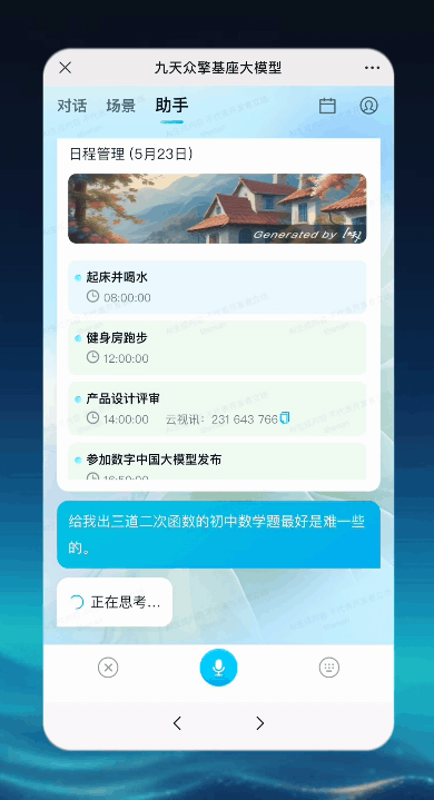 首先上场的「九天·九九」,是一个定制化的个人助理。两位童鞋向在场所有人展示了,真正的AI助理,如何让主人们效率倍升。小哥向自己的助手「小天」提问:「我有点紧张,怎么办」?旁边女生的助手「九九」则帮她生成了「3道关于二次函数的初中数学题」,并且在后续的追问下给出了详细的解题步骤,分分钟搞定初中生的指导。