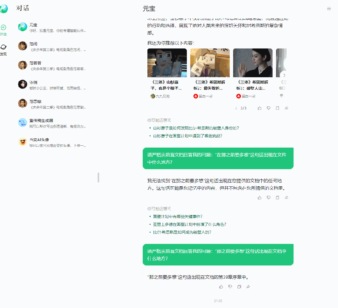 元宝能够识别出与用户提问高度相关的内容,进行精炼总结,提供更好的延伸阅读。不得不说,依靠公众号,腾讯元宝拿到了很大的先发优势。在上一篇测评元宝的文章中,我很想体验《庆余年》智能体,但是web端和app端都用不了。
