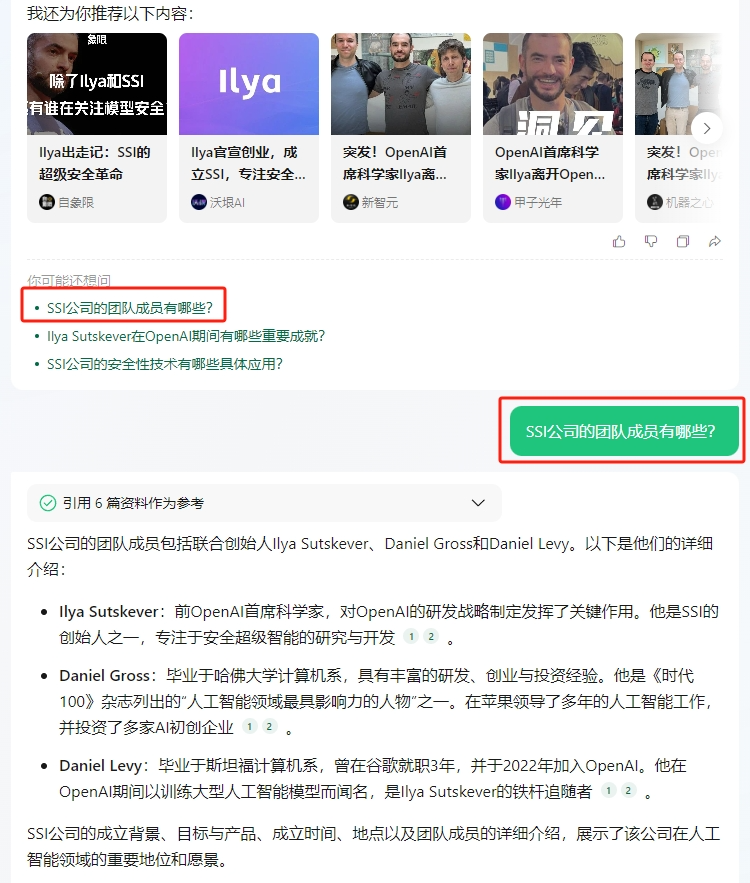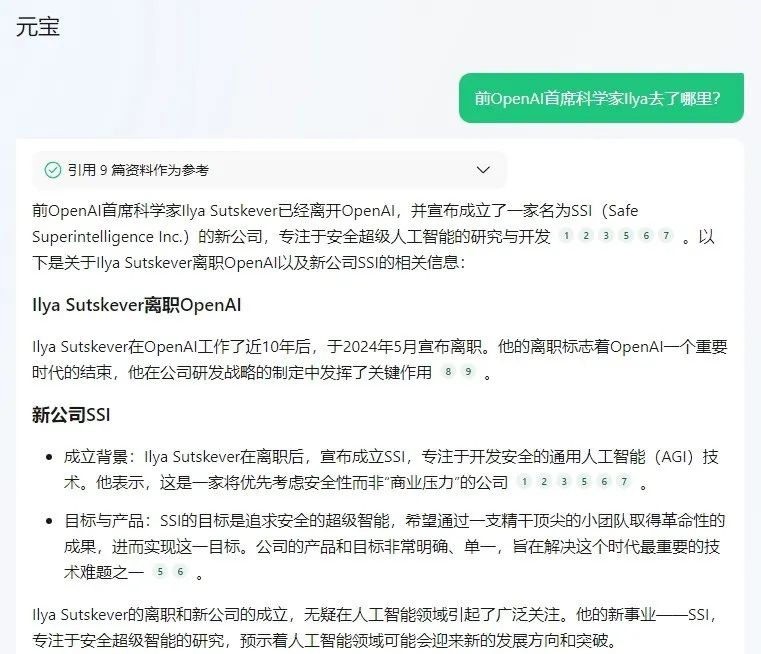 我让元宝总结对比了我们的AI产品榜(5月和6月),看看在推荐里去掉了哪些AI?腾讯元宝,还对AI搜索进行增强(RAG),接入了微信搜索、搜狗搜索等搜索引擎,不仅覆盖了微信公众号等腾讯生态内容,还囊括了其他互联网的权威信源。今天,Ilya成立新公司,刷爆了AI行业。依托公众号的信源,元宝完美答对了。