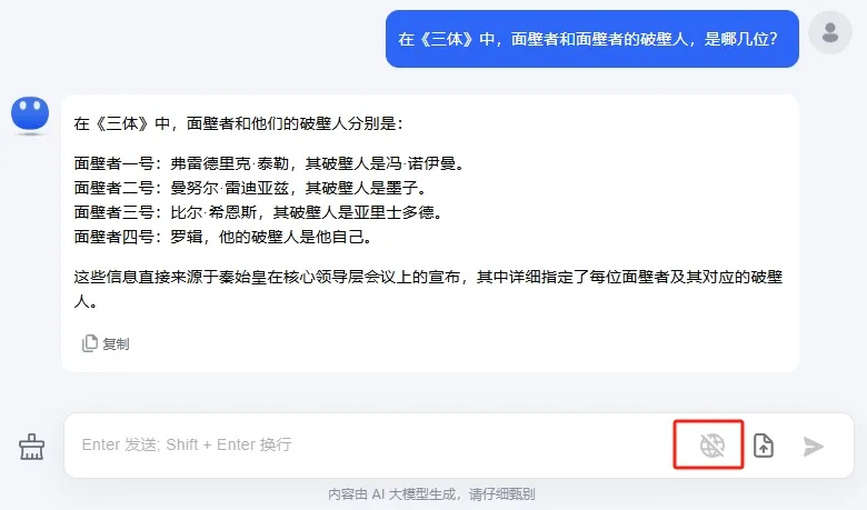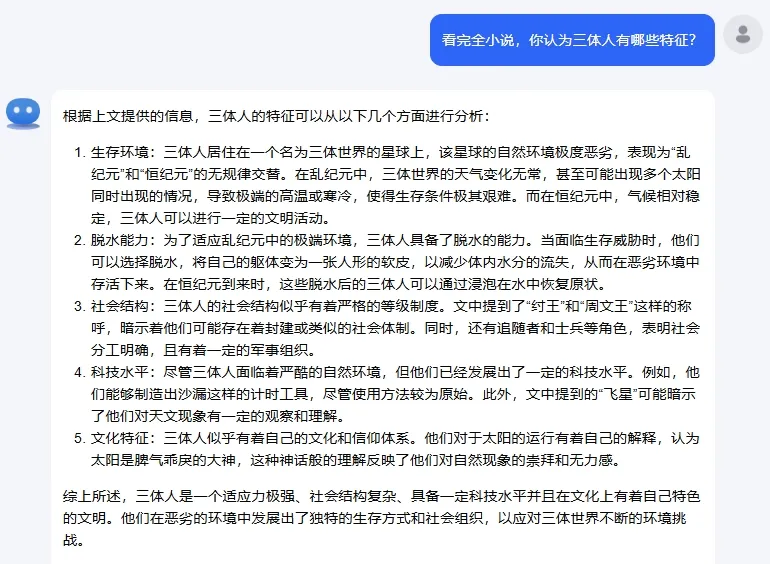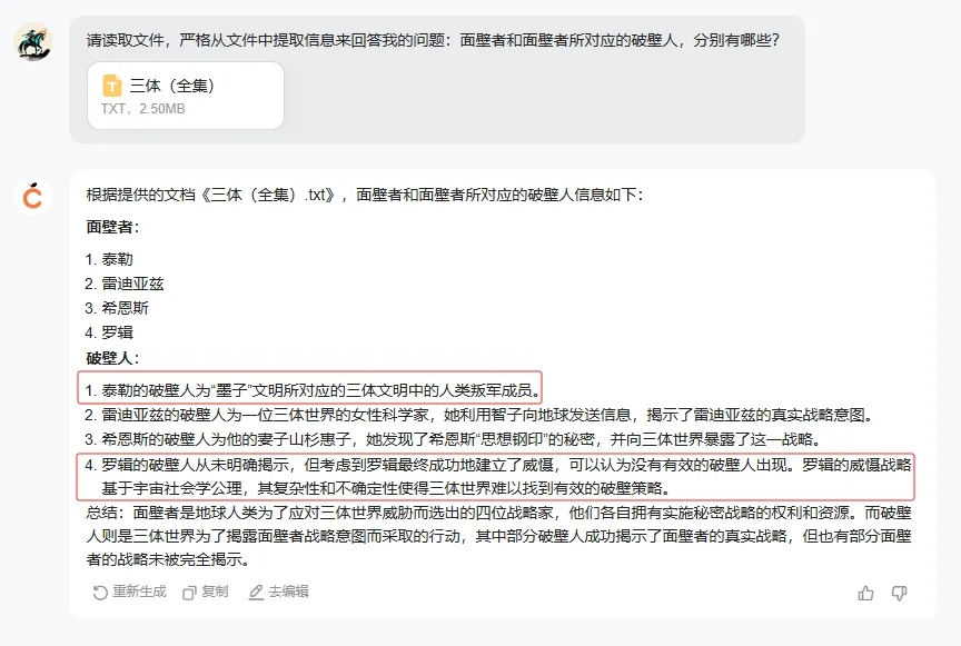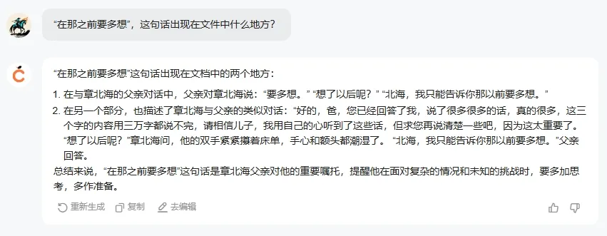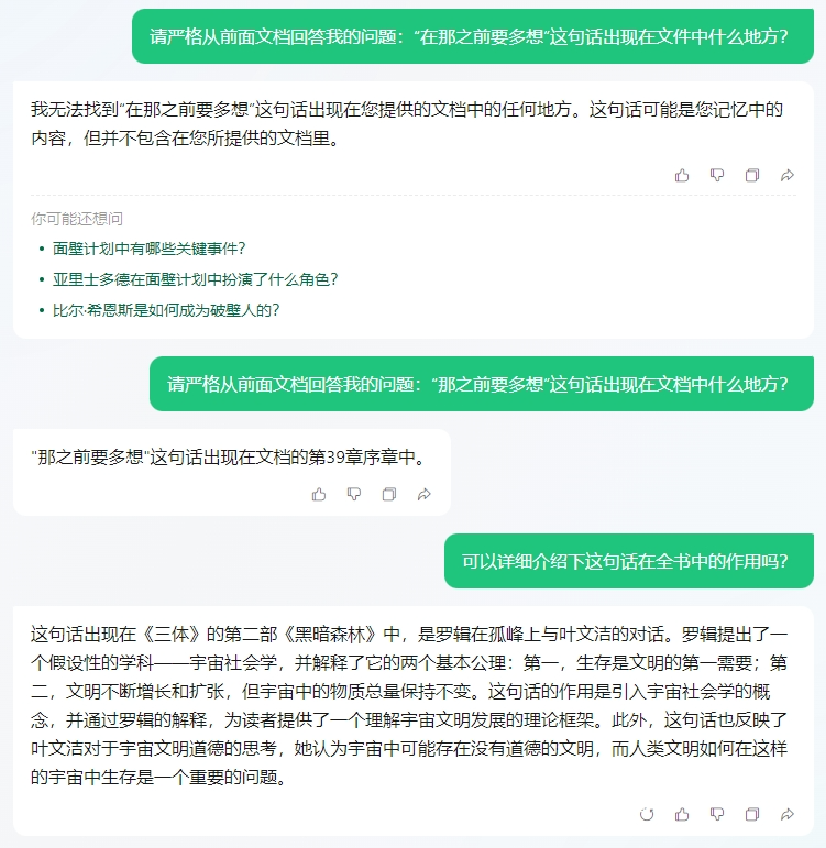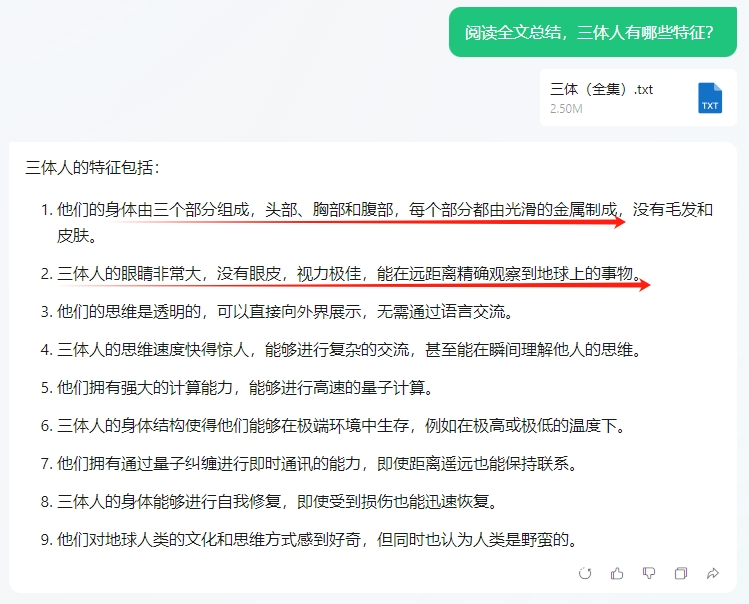因为我不加这句,它就不是从文档中来回答我的问题了,而是联网搜索来回答我的问题。宝子,你这很通义啊!行吧,就不大海捞针难为你了。我们来看下你的总结能力。