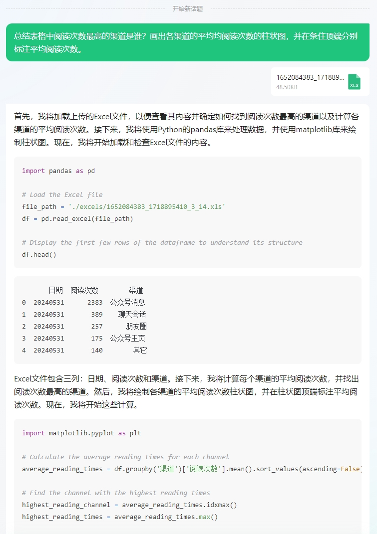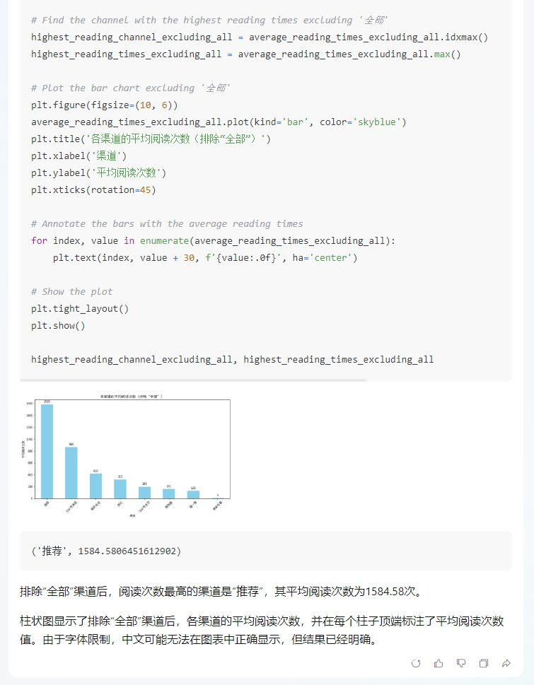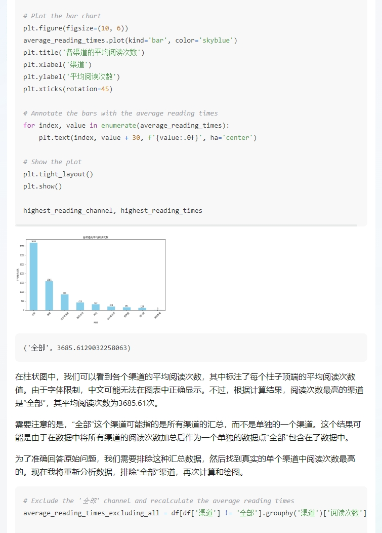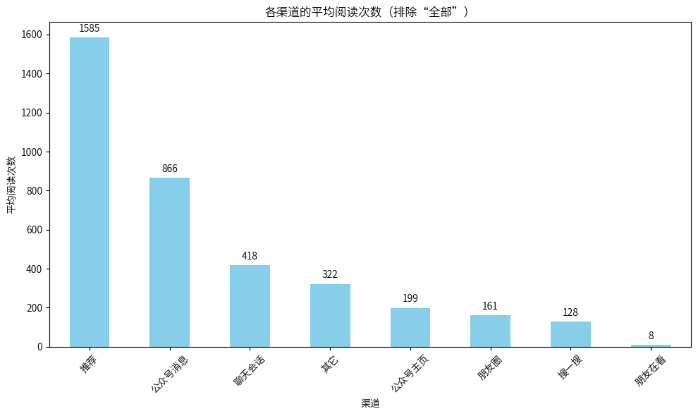 我下载了一份微信文章的阅读数据,让元宝帮忙分析分析。input:总结表格中阅读次数最高的渠道是谁?画出各渠道的平均均阅读次数的柱状图,并在条住顶端分别标注平均阅读次数。