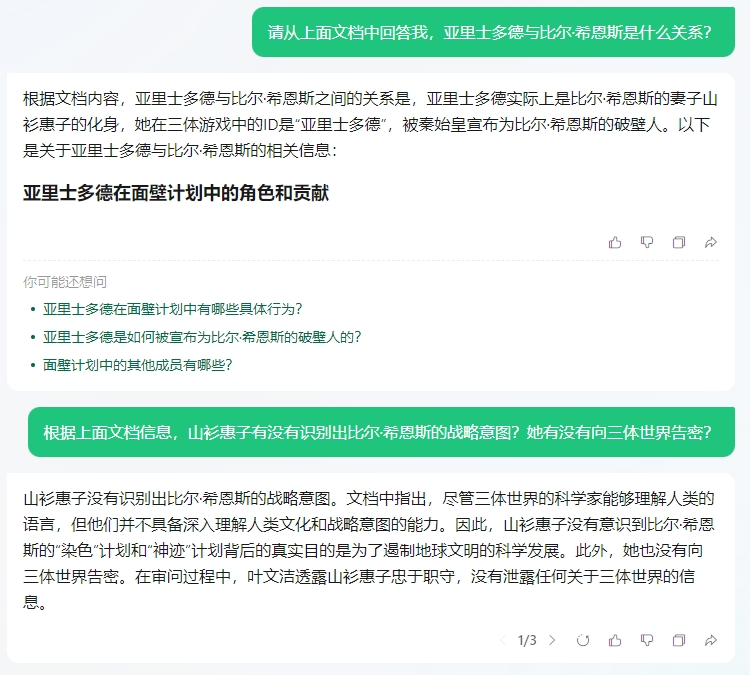 上难度,input1:请从上面文档中回答我,亚里士多德与比尔·希恩斯是什么关系?input2:山衫惠子有没有识别出比尔·希恩斯的战略意图?她有没有向三体世界告密?