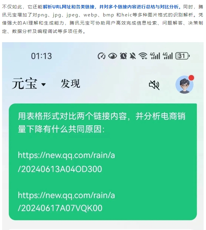 我一共给到了元宝278行数据,它知道如何在海量数据中定位信息,进行计算并出图。这波复现完成度,满分。腾讯混元还介绍,元宝能解析URL和各类链接,并对链接里的内容进行总结和对比分析。