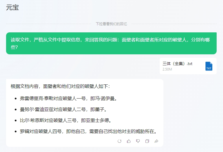 多了一个“在”字,元宝就找不到了。必须一字不少,元宝才能找到,你还有点严谨呢。但是吧……不好意思,你的答案是错的,这句话不是在第39章,而是在第40章。而且,第二个问题就错得更离谱了。从这个细节,大概可以猜到,元宝的1000万上下文,采用了“滑动窗口”技术,它将长文本分割成一段一段,并分别进行总结和标记。这种方法能够快速压缩、录入信息,但同时也会导致信息的丢失,无法完整理解长文本的内容。