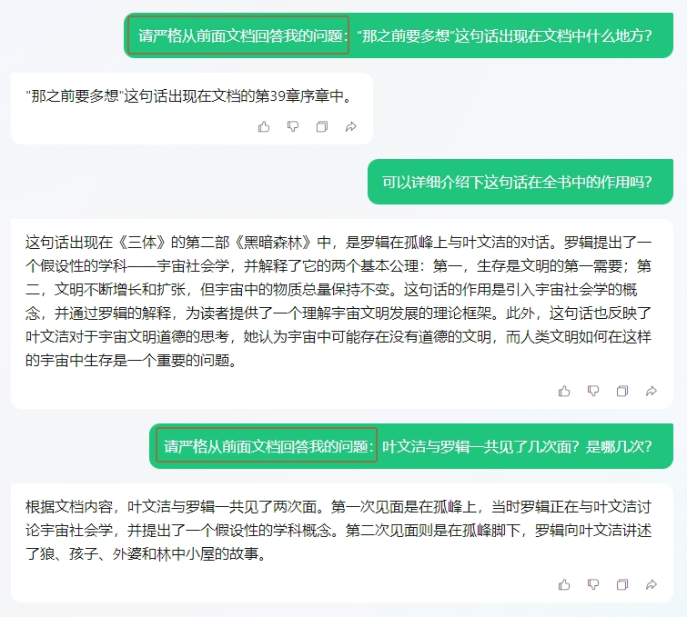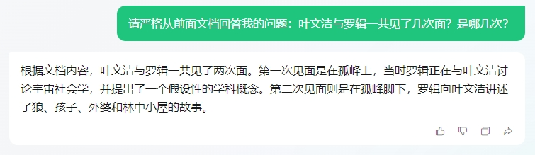 全书中,罗辑只与叶文洁见了一次面。元宝回答中的狼、孩子、外婆的故事,是伊文斯讲给主听的,我罗博士啥时候讲给叶教主听了?而且地点,一个是在孤峰上,一个是在孤峰脚,这不还是同一个地方吗?认真看这篇文章的同学,这时候可能会问了,你为什么每次提问都会加一句“请严格从前面文档回答我的问题”。