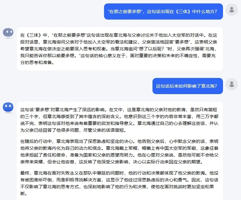 第一个问题答对了,元宝找出了希恩斯的破壁人正是他的妻子山杉惠子。但是第二个问题答错了。山杉惠子在冬眠前的最后一秒,识别出了丈夫希恩斯的战略意图,但是她没有在识别后及时通报三体世界,成为小说中唯一没有破壁成功的破壁人。大海捞针测一下:“在那之前要多想”,这句话出现在书中什么地方?
