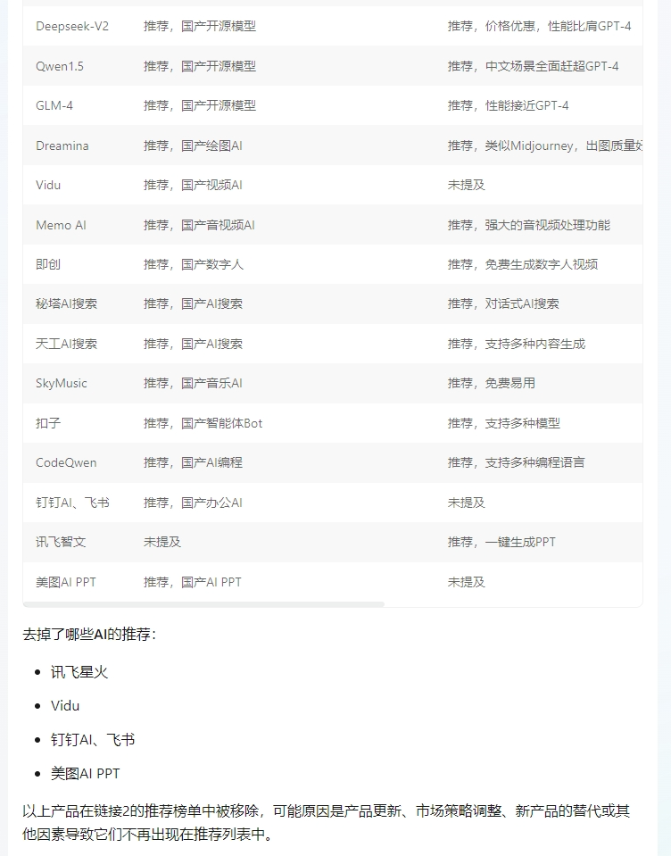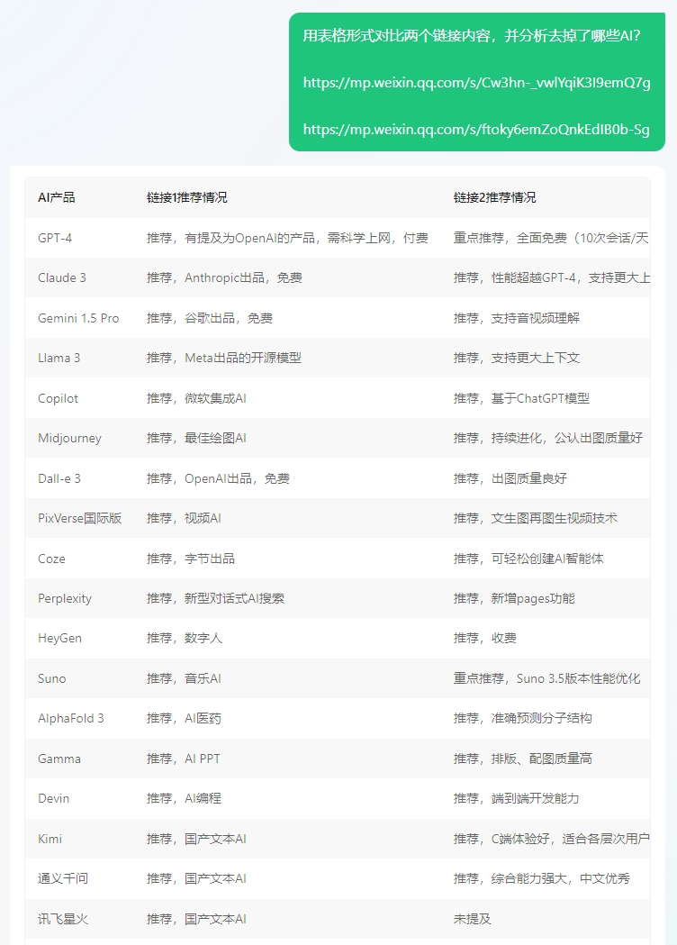 input:用表格形式对比两个链接内容,并分析去掉了哪些AI?