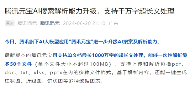 腾讯混元发文称,元宝可以对Excel表格进行解析,并生成柱状图。