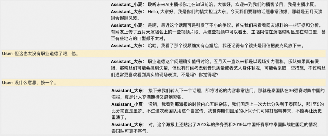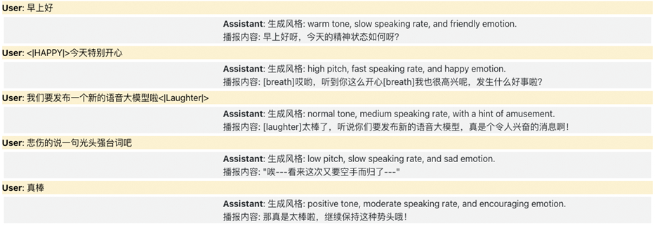 当SenseVoice解析出情绪/情感/咳嗽等副语言信息后,大模型输出相对应的反馈情绪,并由CosyVoice合成出适当的声音情绪,从而完成舒适自然的对话交互过程。在以下示例中,用户和助手的所有对话内容均由CosyVoice合成。