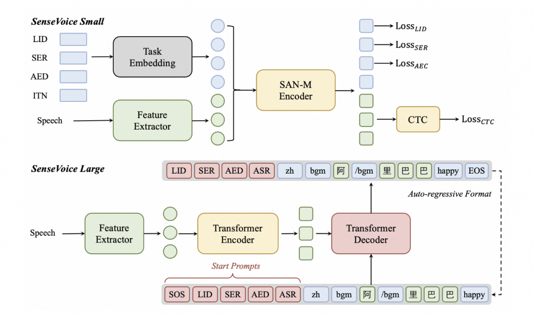 SenseVoice-Small 是一款仅含编码器的轻量级基础语音模型,设计用于快速语音理解。它可以快速处理语音数据,并在有需要时迅速做出响应,适用于对延迟敏感的应用场合,如实时语音交互系统。SenseVoice-Large 则是一个包含编码器和解码器的大型基础语音模型。这个版本的SenseVoice专注于更精确的语音理解,拥有对更多语言的支持能力。它适合于对识别精度有更高要求的场景,可以处理更复杂的语音输入,并生成更为准确的结果。