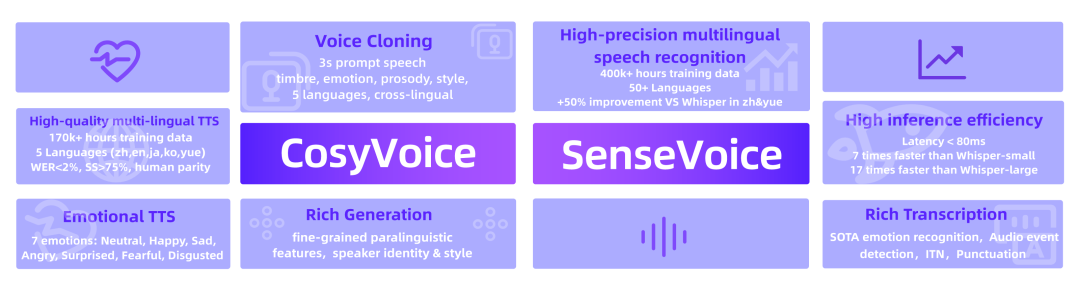 SenseVoice 则专注于高精度多语言语音识别、情感辨识和音频事件检测。
