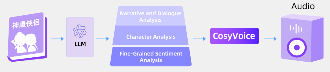 借助LLMs出色的分析能力,可对书籍内容进行结构化并识别其中的情感,再与CosyVoice的语音合成技术结合,我们能够实现具有更高表现力的有声读物。