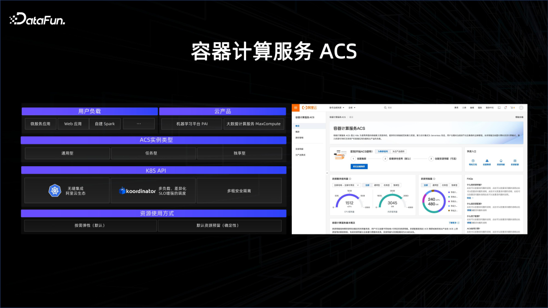 阿里推出了一个容器服务叫做 ACS,也就是通过前面介绍的两个技术把所有资源通过容器化的方式暴露出来,使得用户在大数据平台和 AI 平台上面能够无缝地使用。它是一种多租的方式,并且能够支撑住大数据的需求。大数据在调度上面的需求是比在微服务和 AI 上面都高几个量级的,必须要做好。在这个基础上面,通过 ACS 产品,可以帮助客户很好地去管理其资源。