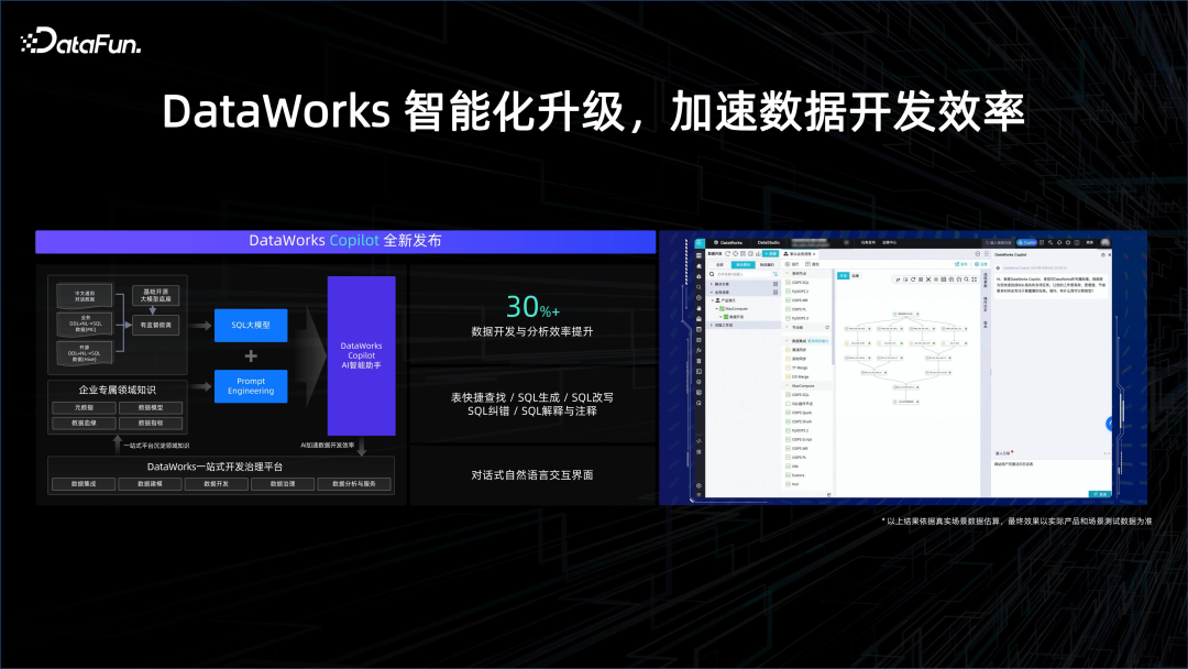在数据处理环节,可以帮助数据分析师更简单地去构建分析,原来可能要写 SQL,学习如何用工具与数据系统进行交互。但 AI 时代,改变了人机交互的方式,可以通过自然语言的方式跟数据系统进行交互。例如 Copilot 编程助手,可以辅助生成 SQL,帮助完成数据开发环节中的各个步骤,从而大幅提升开发效率。