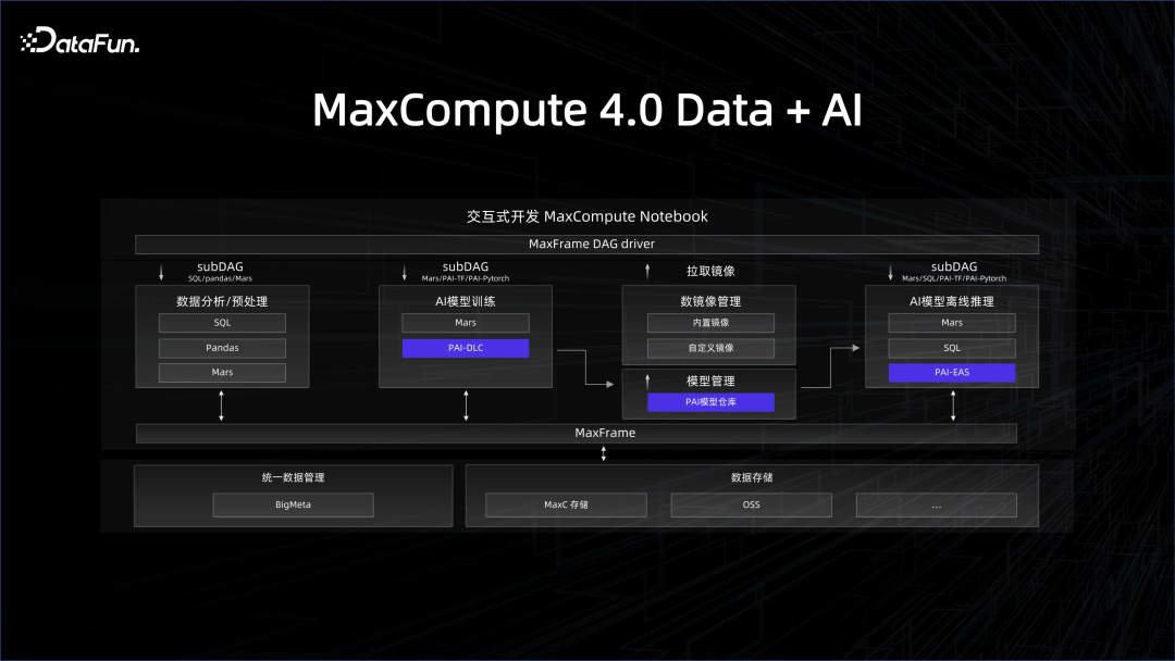 前面介绍的是资源和平台上的管理,数据的管理也是至关重要的,我们一直在耕耘的就是数仓的系统,比如数据治理、数据质量等等。要将数据系统和 AI 系统进行关联,需要数仓提供一个 AI 友好的数据链路。比如在 AI 开发过程中用的是 Python 的生态,数据这边怎么通过一个 Python 的 SDK 去使用这个平台。Python 最流行的库就是类似于 pandas 这样的 data frame 数据结构,我们可以把大数据引擎的 client 端包装成 pandas 的接口,这样所有熟悉 Python 的 AI 开发工作者就能够很好地去使用它背后的数据平台。这也是我们今年在 MaxCompute 上推出的 MaxFrame 框架的理念。