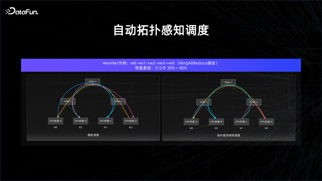 举一个例子,在模型训练的 All Reduce 环节中,如果进行随机调度,cross port 的交换机连接会非常多,而如果精细控制顺序,那么 cross 交换机的连接就会很干净,这样延迟就能够得到很好的保证,因为不会在上层的交换机里面发生冲突。