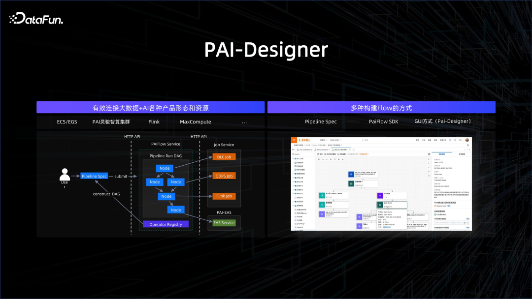 将大数据与 AI 统一管起来只是第一步,更重要的是以工作流的方式将它们连起来。可以通过多种方式建立工作流,如 SDK 的方式、图形化的方式、GUI 的方式、写 SPEC 的方式等等。工作流中的节点可以是大数据处理的节点,也可以是 AI 处理的节点,这样就能够很好地将复杂的流程连接起来。