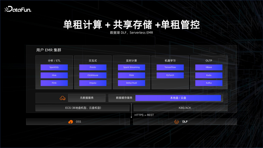 慢慢地会从单租存储走向共享存储,也就是数据湖的方案。数据在一个更加共享的大数据系统里面,计算是动态拉起一个集群,算完了之后这个 cluster 就消亡了,但数据不会消亡,因为数据是在一个 reliable 的 remote 的存储端,这就是共享存储。典型的就是数据湖 DLF 以及 serverless EMR 的方案。