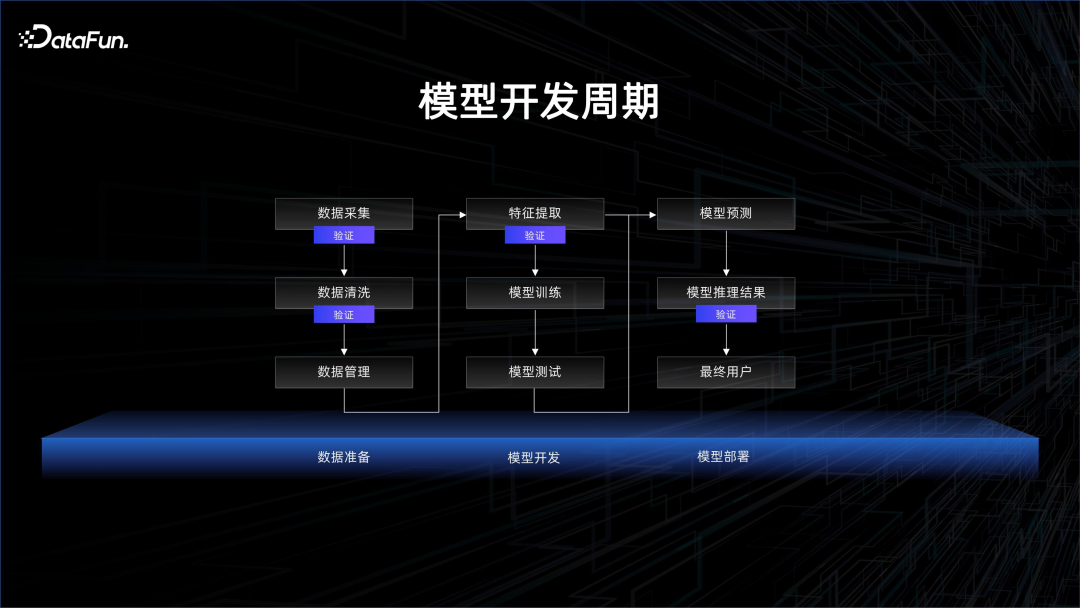 很多人认为模型训练是其中最关键的一步。但其实在模型训练之前,有大量的数据需要采集、清洗、管理。在这个过程中,可以看到有非常多的步骤需要验证,比如是不是有脏数据,数据的统计分布是不是具有代表性。在模型出来之后,还要做模型的测试和验证,这也是数据的验证,通过数据来反馈模型效果如何。