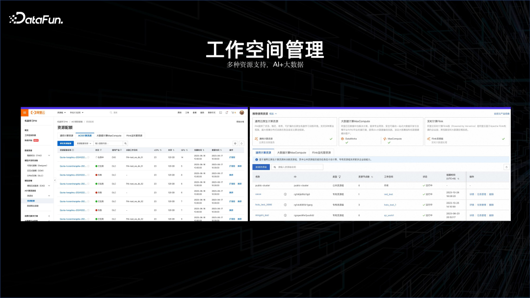 在这个 AI 工作空间里面,支持 Flink 的集群、离线计算集群 MaxCompute,也能够支持 AI 的平台,还支持容器服务计算平台等等。
