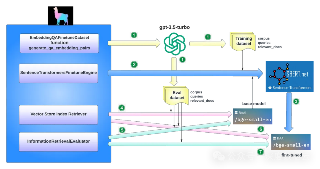 这里的关键思想是,可以使用像GPT-3.5-turbo这样的语言模型生成用于微调的训练数据,以便基于文档块提出问题。这允许我们以一种可扩展的方式生成合成的正向对(查询,相关文档),而无需人工标注者。最终的数据集将是问题和文本块的对。