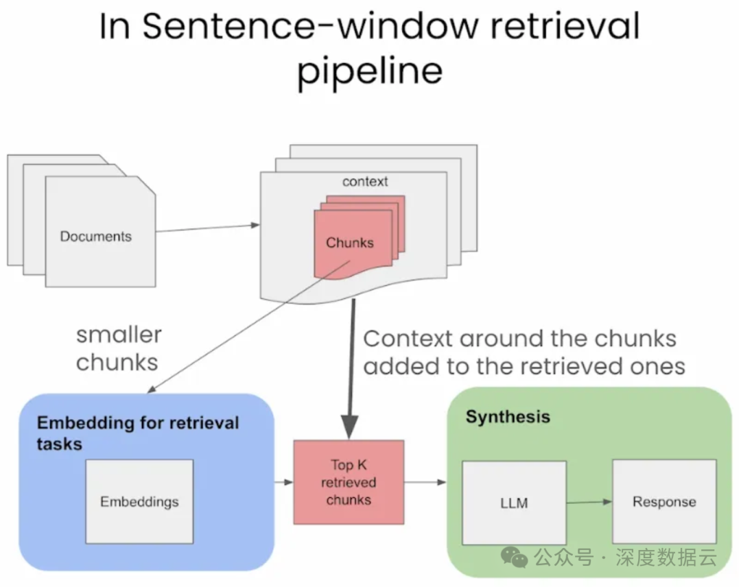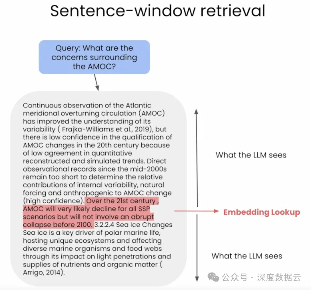 这个过程涉及嵌入一个有限的句子集进行检索,这些句子周围的额外上下文,称为“窗口上下文”,被单独存储并与它们链接。一旦识别出最相似的句子,这些上下文就在这些句子发送给LLM进行生成之前重新整合,从而丰富了整体的上下文理解。